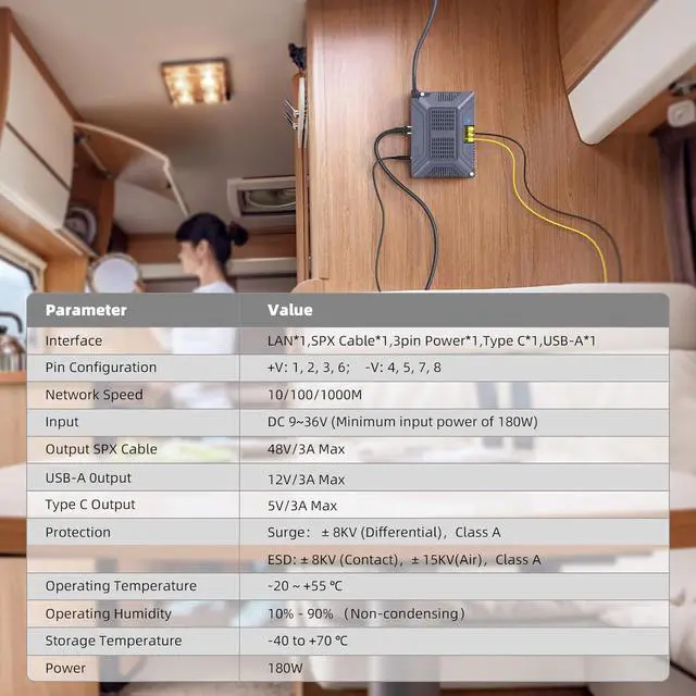 *Durable Protection and Climate Tolerance: The 180W Starlink 12V PoE from QUIDDITY provides superior surge and ESD protection, operates seamlessly in temperatures from -20 to +55°C, and maintains stability in humid conditions (10% - 90% non-condensing). Additionally, its efficient storage capabilities ensure long-term reliability and endurance.