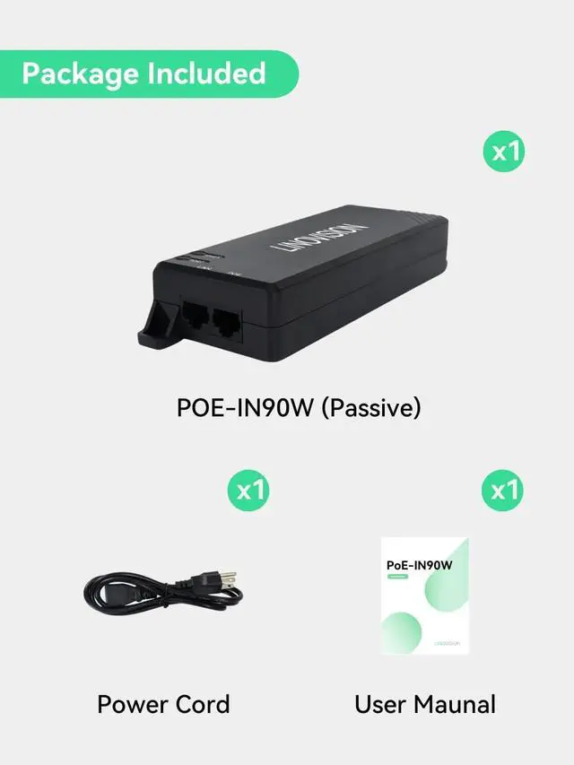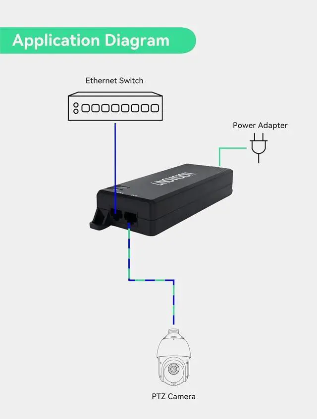 APPLICATION - Compact 90W passive Injector provides safe and reliable power to access points, PTZ IP cameras, and VoIP Phone, etc.