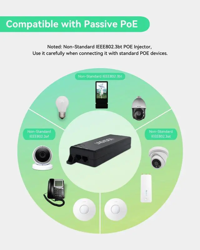 PASSIVE POE - Continuously delivers reliable power to PoE device. It is compatible to non-standard PoE device because it does not execute PoE detection and classification before power up. (Use it carefully with IEEE802.3af/at/bt standard device. Please choose POE-IN9001 then)
