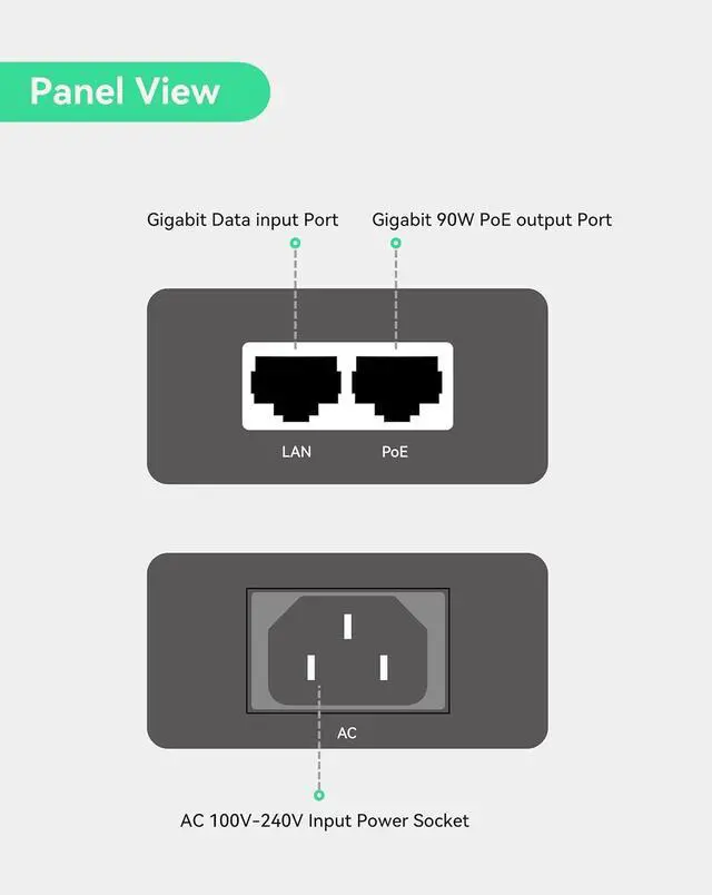BT90W POE INJECTOR - Enable Max. 90W PoE power over single Cat5E/Cat6 network cable, suitable for POE lighting, PoE monitor, PTZ IP cameras, PoE AP, PoE speaker, etc.