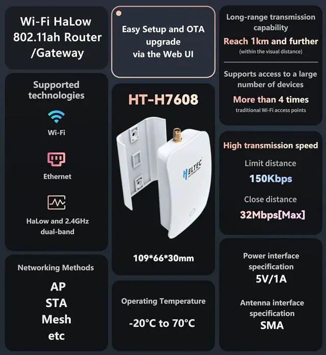 Outstanding Transmission Performance and Device Capacity: Dual-band support for Wi-Fi HaLow and 2.4GHz, with a range of up to 1km. Maintains a speed of 150Kbps at the maximum distance and up to 32Mbps at close range.