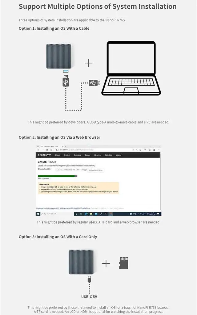 [Multi-System Support] NanoPi R76S mini router is compatible with a wide range of operating systems, such as FriendlyWrt 24.10 (based on kernel 6.1), OpenMediaVault, OpenWrt, Ubuntu Noble Core, Debian Bookworm Core, etc. It also supports Android to meet the needs of different users in network, server, desktop applications and other scenarios.