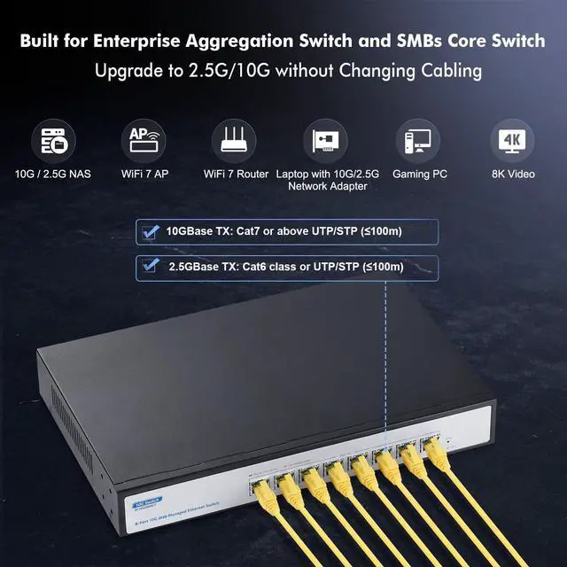 Network Protocol: The 10G managed switch support IEEE 802.3ae (10G Ethernet), IEEE802.3bz (2.5G/5G Ethernet), IEEE802.3ab (Gigabit Ethernet), IEEE802.3x (Flow control), IEEE802.3az (Efficient and energy-saving). 1000Base-TX: Cat5 or above UTP(100m), 10000Base-T: Cat6 or above UTP(50 meter).