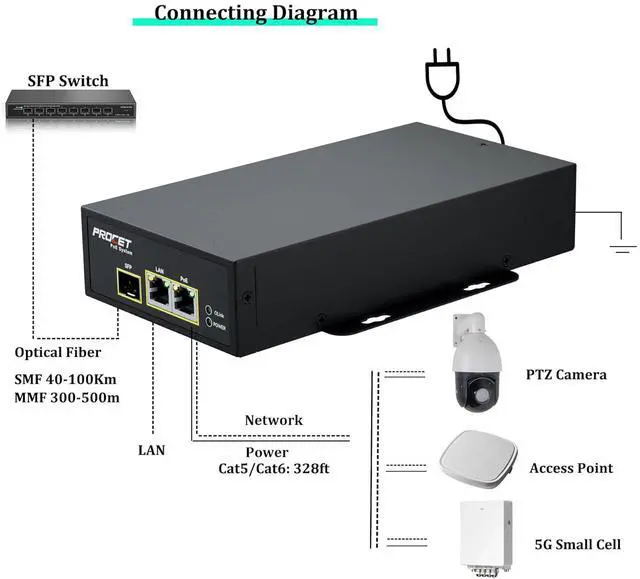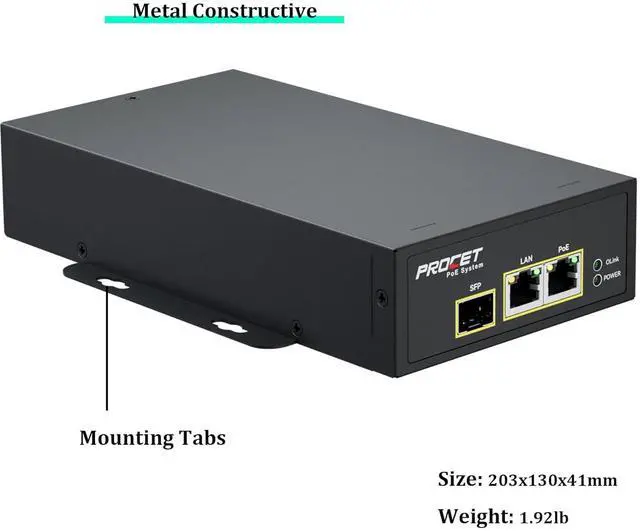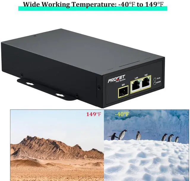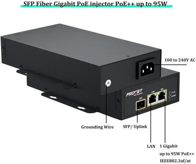 PROCET SFP Fiber PoE Injector PoE++ up to 95W Gigabit Uplink Support Power Over Ethernet, Wide Temp -40 to 149 for PTZ Webcam, Sisco Access Point, Small Cell, Smart Factory, Commercial Display TV
