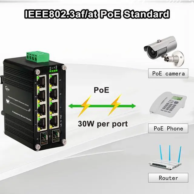 IEEE802.3af/at PoE (30W) standardThis Switch supports IEEE802.3af/at PoE (30W) standard, can easily power multiple devices, reducing the need for additional power cables or adapters.