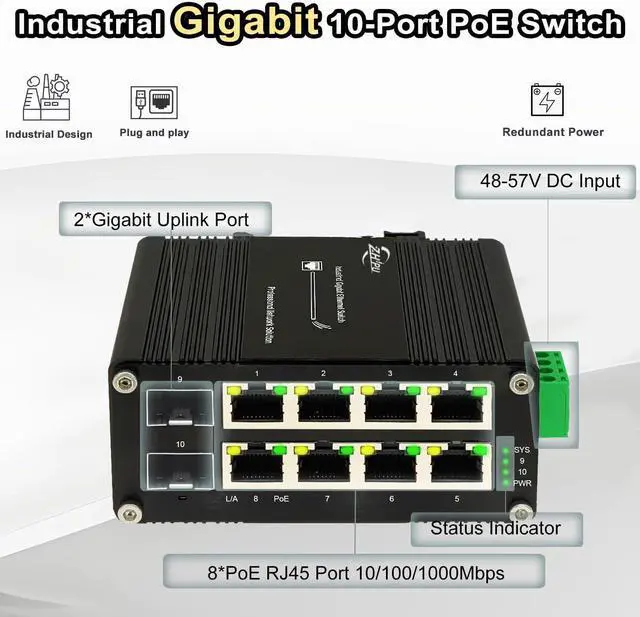 Easy Installation & Robust BuildSupports DIN-Rail and wall-mount installation, with rugged construction to withstand vibration and shock in industrial settings.