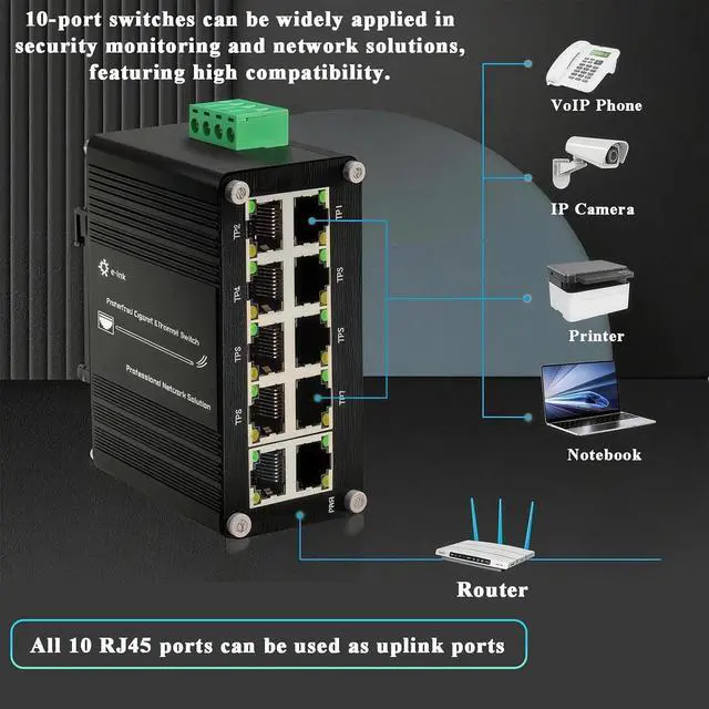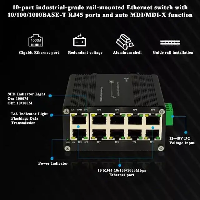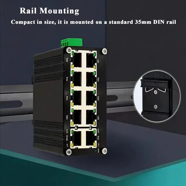 This Mini Industrial unmanaged 10 ports Gigabit Network Switch supports 10/100/1000Mbps RJ45 Port. It complies with CE and FCC standards and passed the 100% burning test.