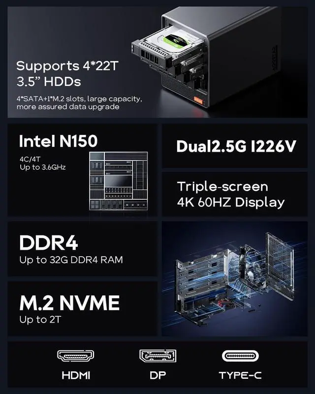 Mini PC with 4 Drive Bays The DIY NAS MINI PC is compatible with 3.5" and 2.5" SATA HDD up to 4*22T,and you can also install additional compact M.2 NVMe SSD drives up to 4TB each. With all slots used, the maximum capacity is a truly massive 92TB.Tool-Free Installation-The drive bays are made of flexible and durable materials, no screws, and tools needed to help you easily install the hard drives