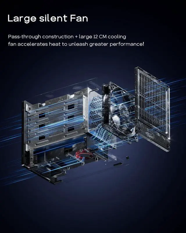 Superior Cooling and Ultra-Quiet Operation The mini PC features a through-wall construction with a 12cm fan for excellent heat dissipation, while maintaining near-silent operation. Intelligent fan control adjusts cooling based on workload, and the dustproof design prevents dust from entering the system, ensuring stable operation over long periods.