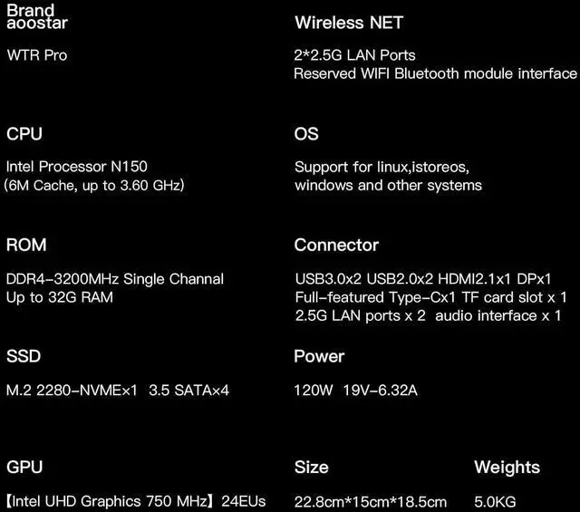 All of the packages include1 x AOOSTAR N150 WTR PRO Mini PC, 1 x power supply, 1 x HDMI cableAny questions, please email us or contact us with AOOSTAR offical si//teWe are always ready to listen to you.