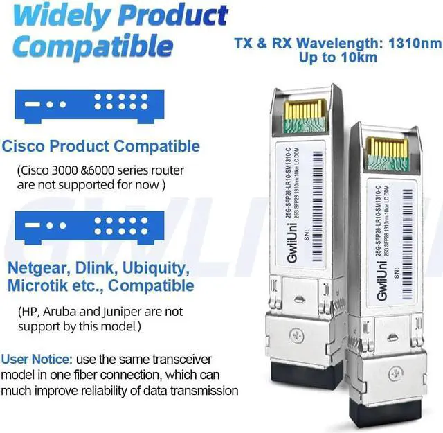 Widely Compatible The 25G SFP transceiver are widely compatible with Cisco products(Cisco 3000 &6000 series router are not supported) and Netgear, MikroTik, Ubiquity, DLink etc., ( Not recommended for HP, Juniper and Aruba products). The fiber module also works well with switch, router, server and more 25 gigabit SFP28 optical ports