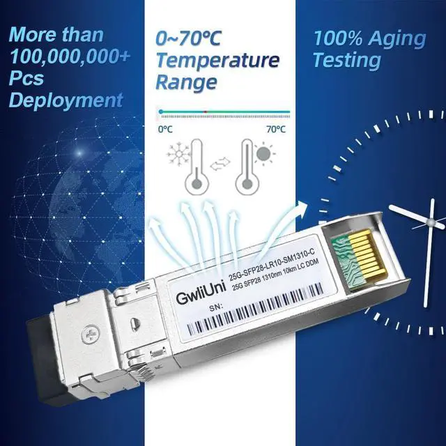 100% Aging TestingThe gold finger of 25G SFP28 module are carefully examined to reach the perfect combination of circuit assembly precision. All SFP are 100% aging testing after assembling to ensure that all sold modules are stable and high reliability