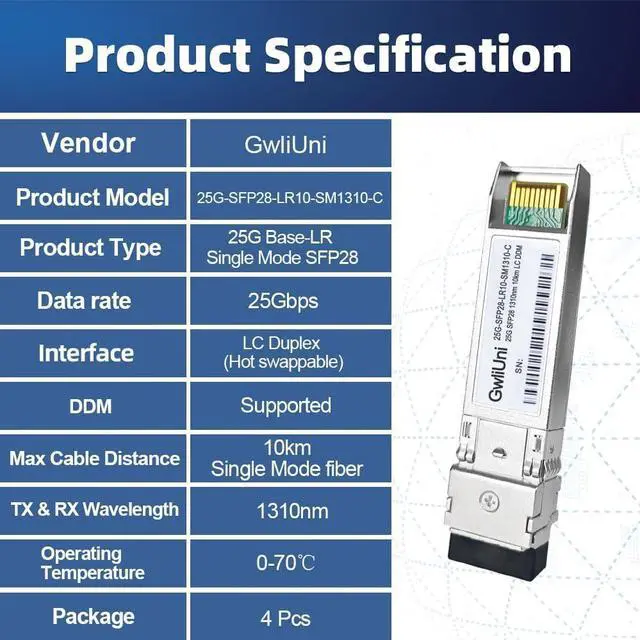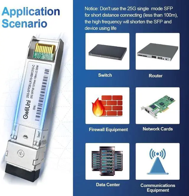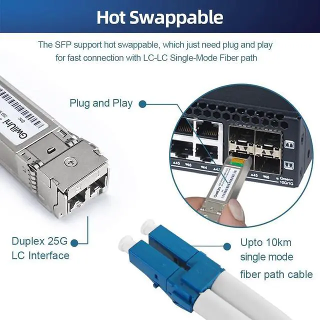 Fast & Convenient Connection The 25G SFP support hot swappable, which just need plug and play for fast connection with LC-LC Single mode fiber path.