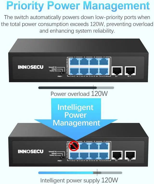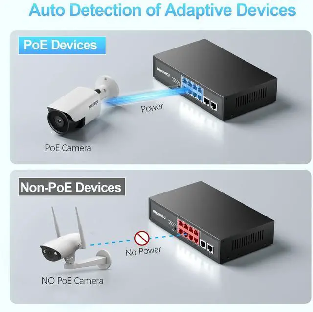 The PoE switch provides power to the connected devices, no need separate power cables. PoE network switches are often used in network deployments where power outlets are scarce or when the devices are located in hard-to-reach places.