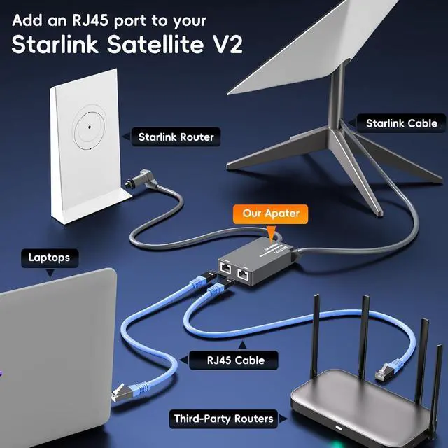 Add Two RJ45 Ports to Your Starlink Satellite V2Starlink v2 ethernet adapter features two Gigabit Ethernet (RJ45) ports, can use the starlink cable to connect your router and dish to get 2 extra RJ45 ports. allowing you to connect two wired devices directly to your Starlink system.