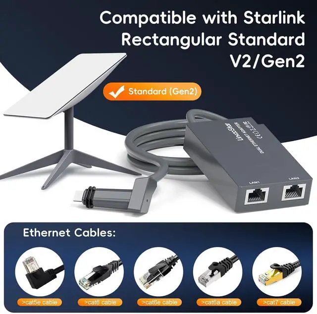 Specially Designed for the Starlink Actuated Gen 2This starlink v2 ethernet adapter is High-performance satellite internet connectivity solution designed specifically for the V2 rectangular dish. Tailored for Starlink rectangular dish users, providing reliable and efficient Ethernet connection. IS NOT compatible with other model.