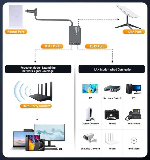 Two Working Modes for Your ChoiceThis starlinkg v2 Ethernet adapter has two working modes (repeater mode and LAN mode). For repeater mode, use adapter connecting with a third-party router to extend the network signal coverage to places where the original signal is not good, so that you can connect your mobile phone, tablet computer, and laptop to the Internet freely; for LAN mode, you can use wired connections to TVs, network switches, game consoles, printers, VolP phones, security cameras, routers, etc. to make the network connection more stable.