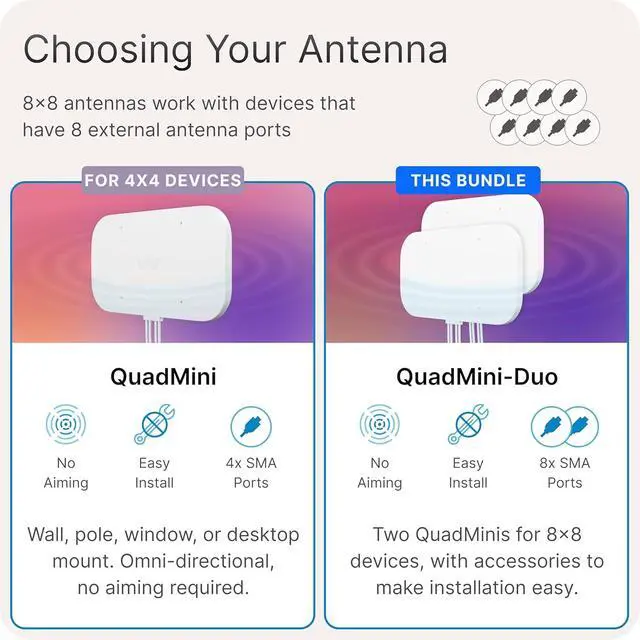 8x8 MIMO IN A SINGLE PACKAGE: We've bundled two of our quadminis together to create the first 8x8 MIMO kit of its kind. Mount these two antennas either above one another, or side by side to get the most out of your 8x8 MIMO Cellular router, like the AT&T Air Home Internet Router, or Rogers Fastmile Gateway.