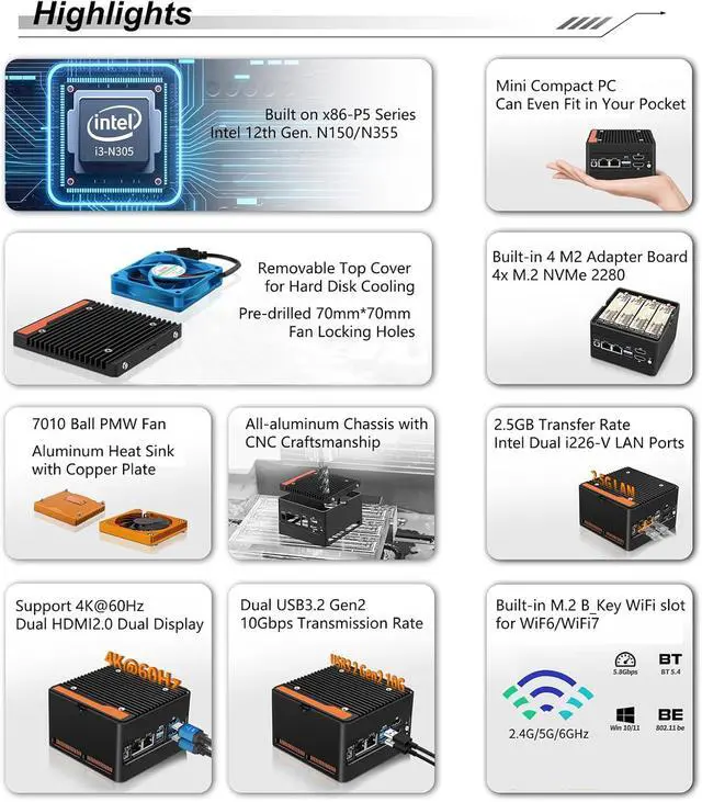 CPUIntel Twin Lake N150 / N355 OptionalRAM1* SO-DIMM DDR5 4800MHz, Max 48GBSSD4* M.2 2280 NVMe PCle3.0 x1 signalingDisplay2* HDMI2.0 (support 4K 4096x2160@60Hz)Network2* Intel i226-v 2.5GBUSB2* USB3.2 Gen2 10GbpsWireless TechnologyM.2 B_Key slot, supports BT5.4 / WiFi6 / WiFi7 modules (NOT Included)Heat DissipationCopper sheet heat conduction aluminum profile cooling, 7010 ball fan blades, PMW four-wire temperature control silent fanSizeCase: 3.94 x 3.94 x 2.3 inch (100 x 100 x 58.5 mm); Mainboard: 3.54 x 3.54 inch (90 x 90 mm)BIOSAMI EFI BIOS, supports Auto-power-on, Wake-on-LAN, PXEPower SupplyDC-IN 12V (55mm*25mm)OSSupports Windows 10, Windows 11, Linux, NAS, etc. Supports dual 4K display at 4096x2160@60Hz to give you a better visual experience