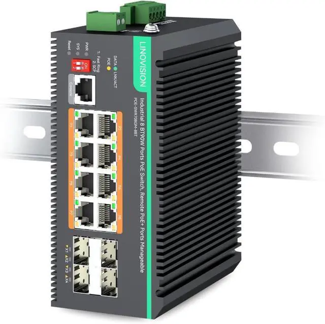 8 BT Full Gigabit PoE++ Switch - 8 x BT 90W output + 4 x Gigabit SFP Uplink Ports + 1 x RJ45 Console Port. Total PoE budget is 460W. Sufficient power for all IEEE 802.3af/at/bt PoE devices in the market.