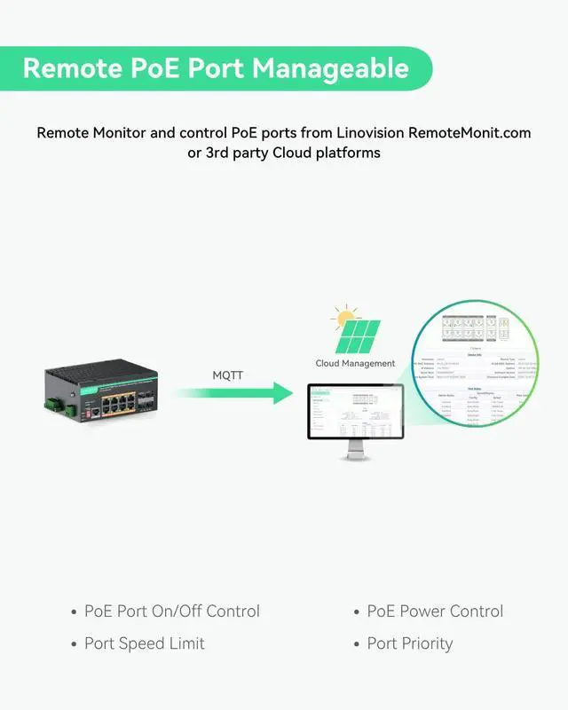 L2+ Management and Remotely Cloud Access -Supports L2+ management functions like VLAN, QoS, ACL, Static Routing and Link Aggregation, as well as automatic ONVIF cameras discovery. Device management through WEB GUI, Telnet, SSH, CLI, SNMP, and MQTT Cloud (RemoteMonit Cloud)