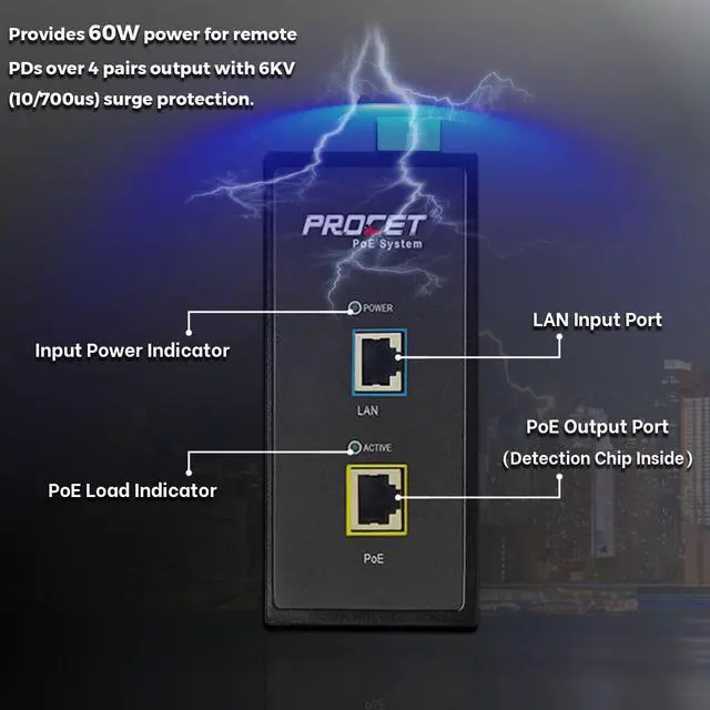 Built-in detection chip automatically identifies IEEE802.3af/802.3at/802.3bt standards, providing the necessary power to PDs while preventing power delivery to non-PoE devices to ensure protection.