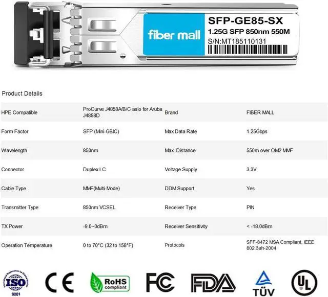 1000BASE-SX SFP Transceivers compliant with Gigabit Ethrnet , up to 550m For MMF transmission, compatible with SFP Multi-Source Agreement and SFF-8472 digital diagnostics functions ,specified in IEEESFF-8472 MSA Compliant, IEEE 802.3ah-2004 1