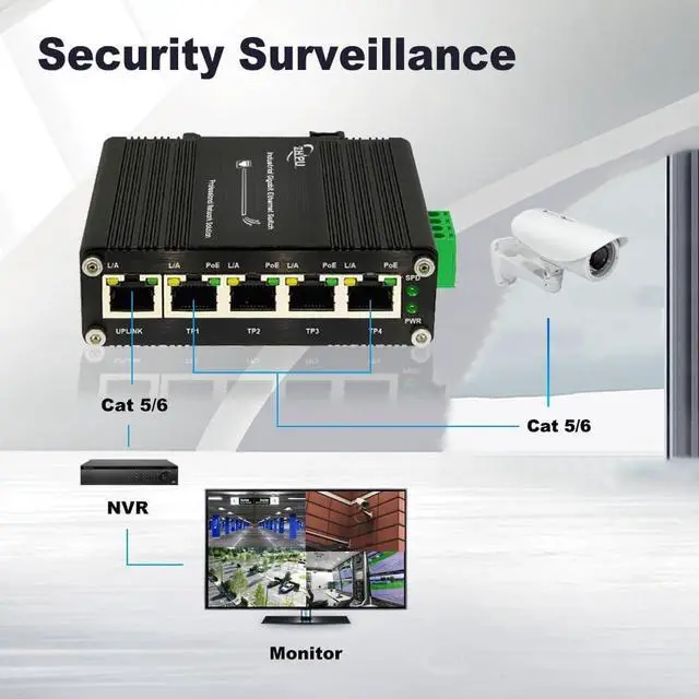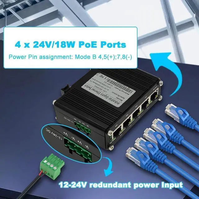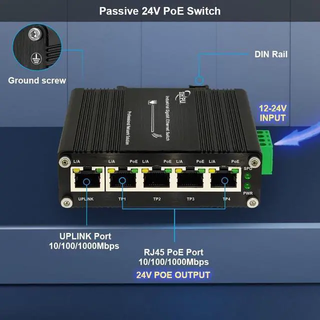 - The passive 5-Port Ethernet PoE switch supports 12-24V DC input and increases voltage to 24V PoE output.