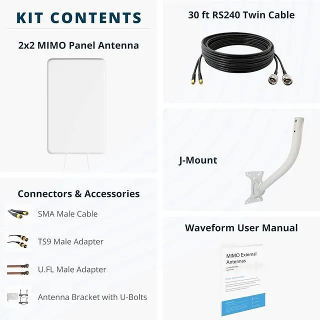 SAY GOODBYE TO LOW QUALITY VIDEO CALLS - The MIMO Panel Antenna Kit by Waveform uses a Cross-Polarized Panel antenna, with up to 8dBi of gain over 600-2700MHz to give your LTE modem or hotspot the speed it deserves.
