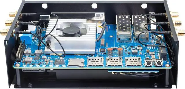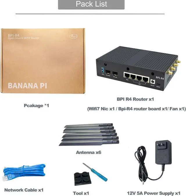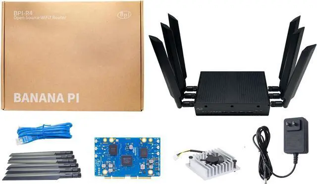 [Out-of-the-box] The Banana Pi BPI-R4 Router shown in is the installed version (BPI-R4 router board, WIFI7 NIC module, 6 antennas, metal casing are all installed), no need to install by yourself, you can use it right out of the box. The eMMC has installed the OpenWRT firmware, you can use Tri-band WIFI function right after you turn on the router to enjoy the network environment.