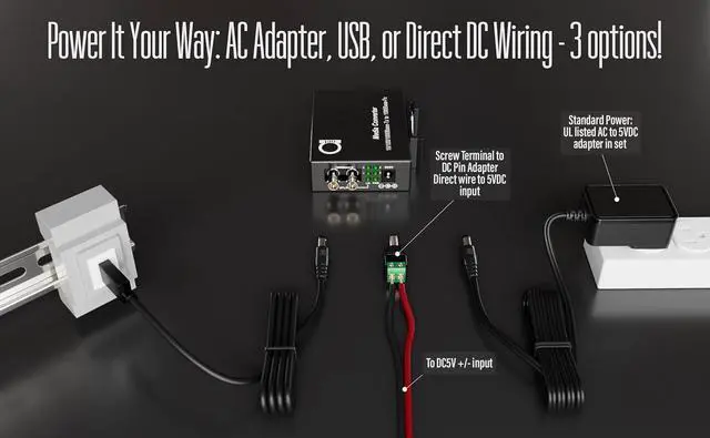 3 Power Options Included AC, USB, and DC UL & PSE certified 5V power adapter, USB-to-barrel cable, and screw terminal plug give you reliable power in any setup: desktop, mobile, or control panel.