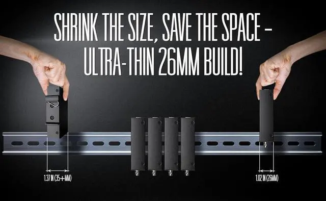 Ultra-Compact and Easy to Mount Only 26mm wide for dense DIN rail installations. Supports both DIN rail and desktop mounting for flexible integration in tight spaces or workbench setups.