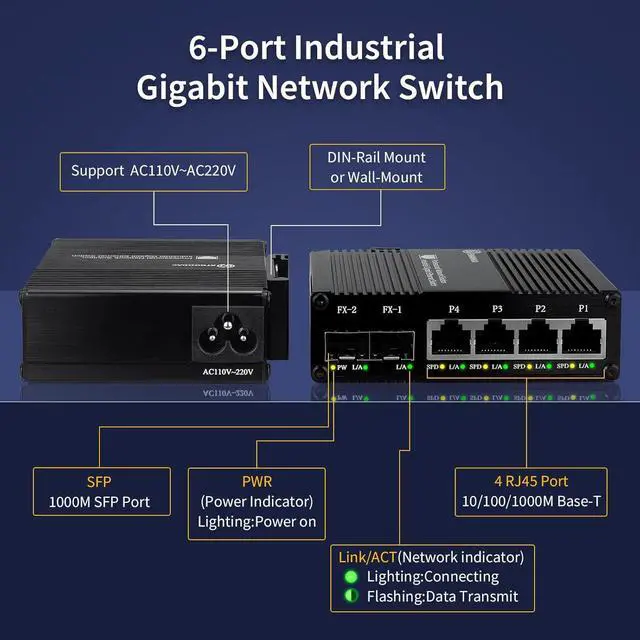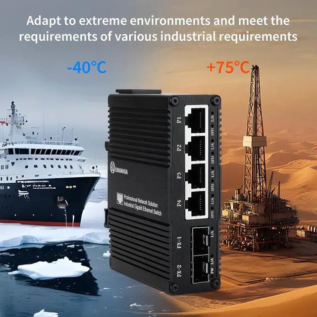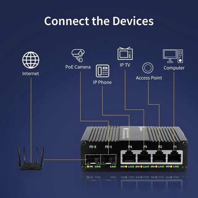 Stable and Quiet Durable aluminum case with 6KV lightning protection, fanless silent design for more power saving, small size, wide temperature range -40~75°C, LED indicator lights, stable operation, easy to maintain network status.
