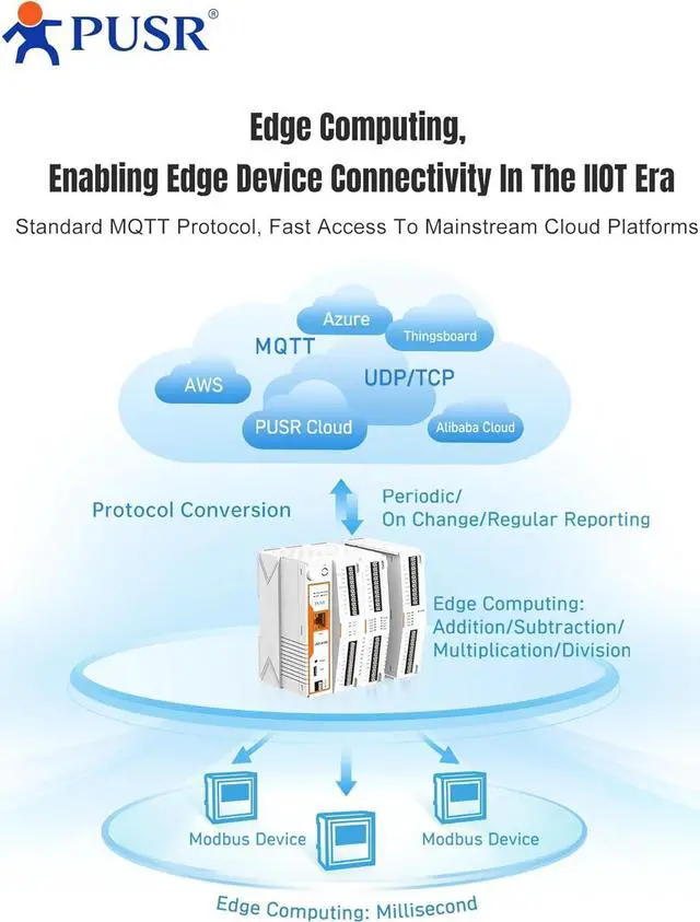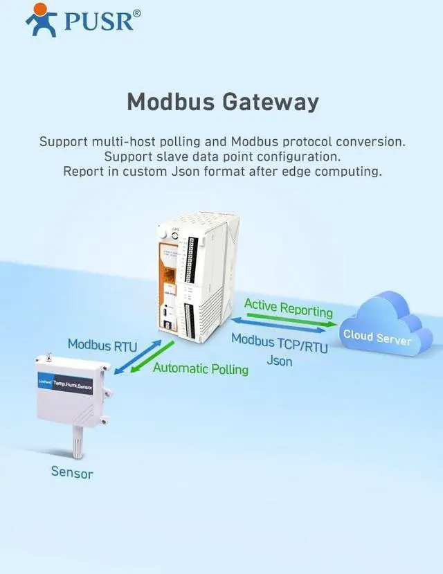 Cloud support: MQTT via PUSR Cloud, AWS IOT, Microsoft Azure, Thingsboard, Alibaba Cloud, EMQX, Cumulocity IoT and so on