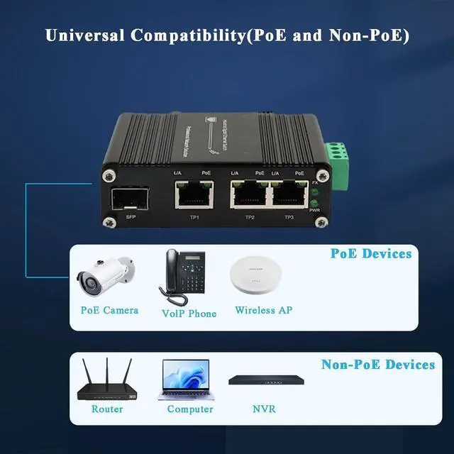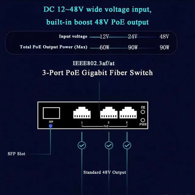 IEEE 802.3af/at-Compliant PoE Switch:This unmanaged ethernet switch features 3x 10/100/1000Base-T RJ45 portseach compatible with IEEE 802.3af/at (30W max per port) and equipped with auto MDI/MDI-X. It also includes 1x SFP port.
