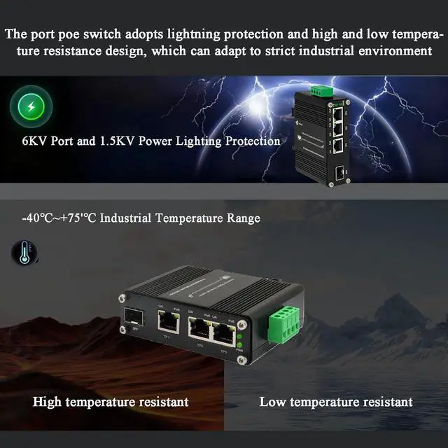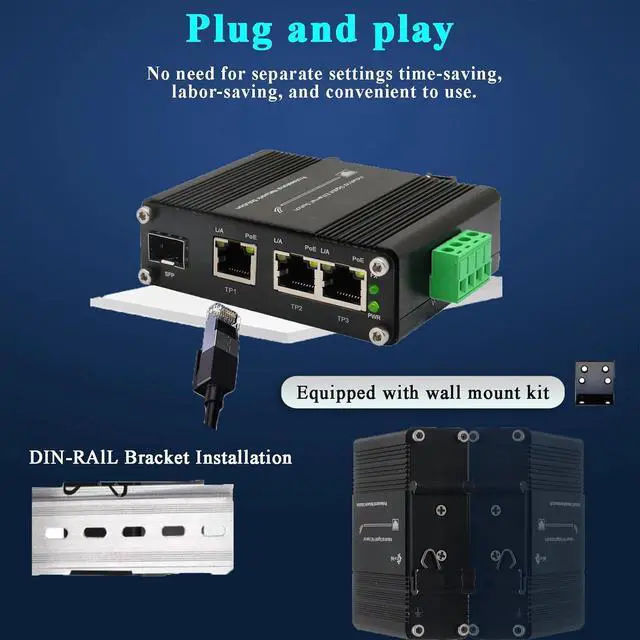 Compact Design with Flexible Installation:Measuring just 3.74 x 2.76 x 1.18 inches, this ultra-compact switch is engineered to fit seamlessly into control panels, telecom cabinets, and tight DIN-rail slots. Designed for tool-free installation, it supports both DIN-rail and wall-mount configurations, enabling quick deployment in space-constrained environments without requiring complex setup procedures.