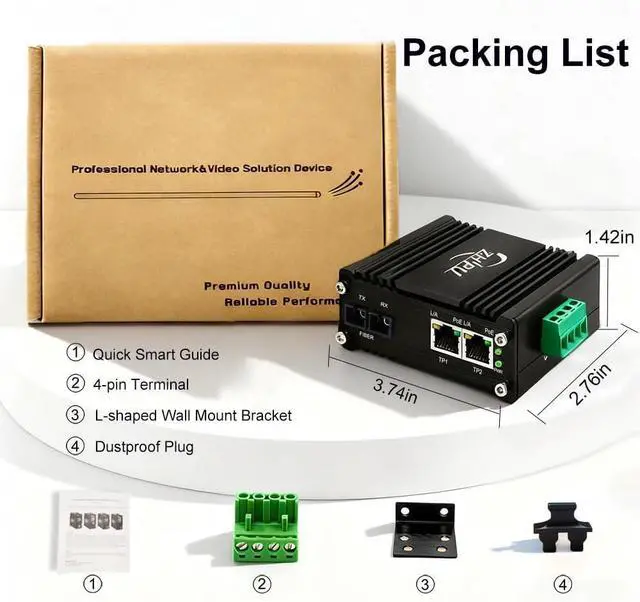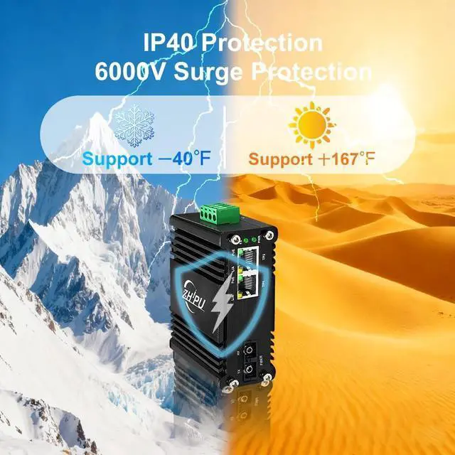 : 6KV surge protection capability. Operate under the temperature range from -40°F to 167°F. Small size 7.34×2.76×1.41in (90×70×36mm).
