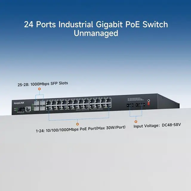 Industrial Gigabit PoE Switch: 24 x Gigabit PoE+ Ports, 4 x Gigabit SFP+ Slots. Total power 400W. Supporting IEEE802.3AF/AT, with a maximum power of 30W/port.