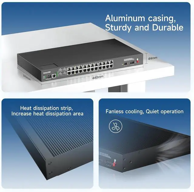 Redundant Power Supply: Supporting redundant power access to ensure stable network operation. Automatic fault switching, anti-reverse connection does not damage the equipment, higher reliability, power supply sold separately.