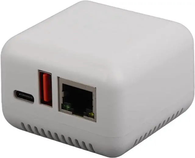 MULTIPLE INTERFACES: Computer print server adapter with Type C power supply port, printer USB connection port, and network cable interface.