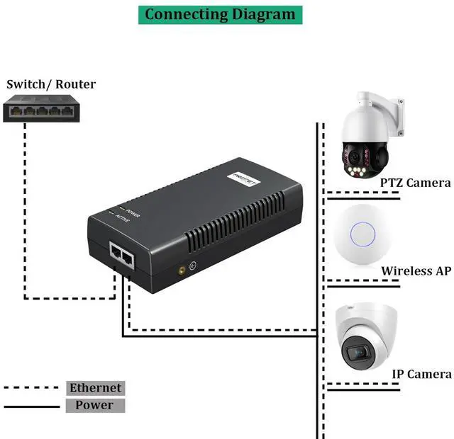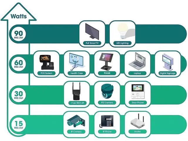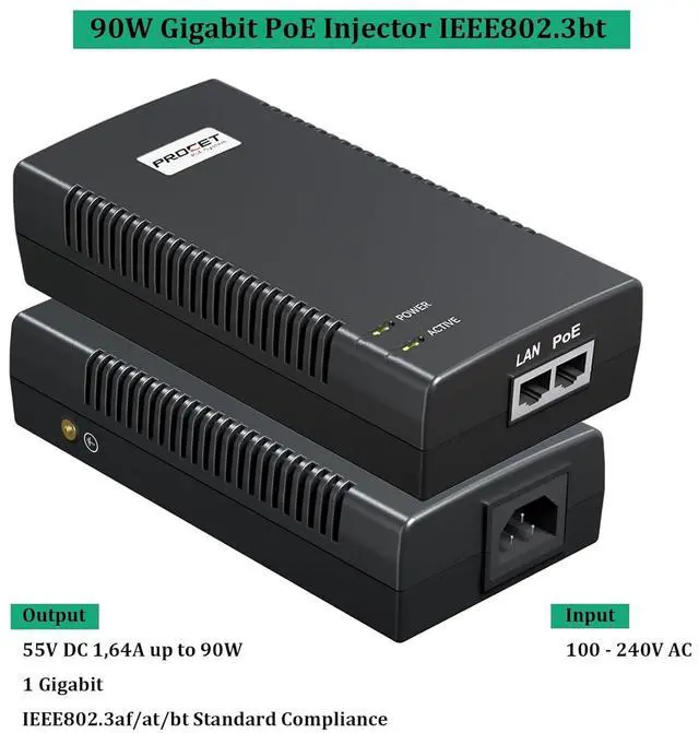 High Power Output Total up to 90W output makes it suitable for a wide range of PoE Powered Devices (PDs) such as HD PTZ Camera, IP Cameras, wireless APs, PoS system, IoT application, door locks, displays, POS, and information kiosks, base station.