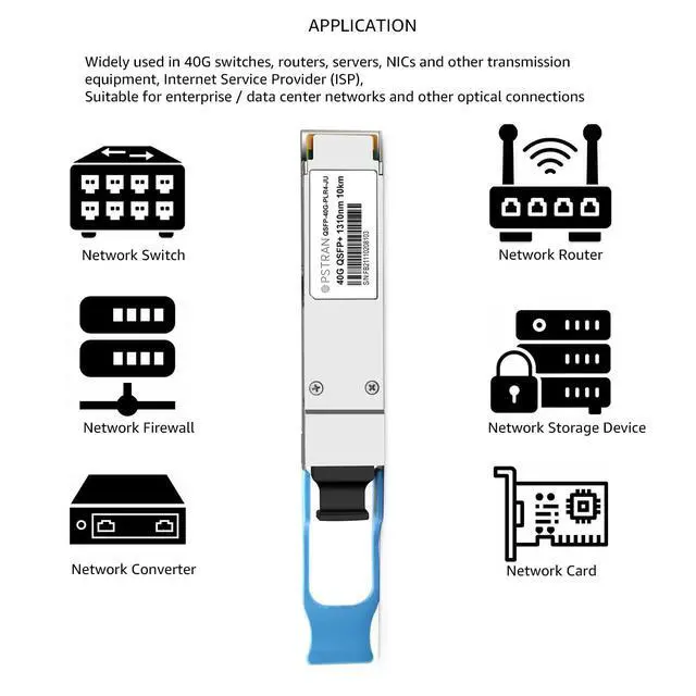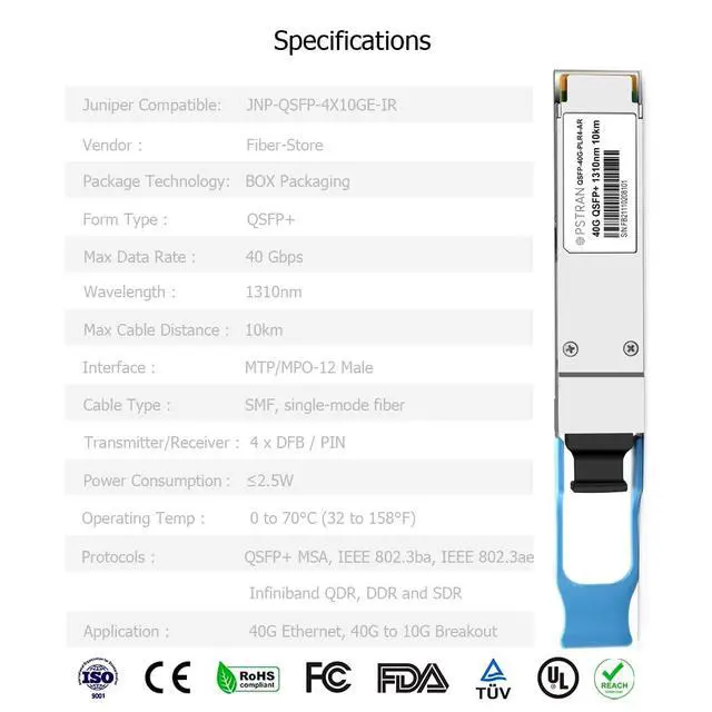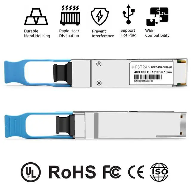 40GBASE-PLR4 QSFP+ Optical Transceiver Module, Built-in high performance Chip, Max. Power Consumption 2.5W enable Prolonged Service Life, Commercial Temperature Range 0 to 70°C (32 to 158°F)