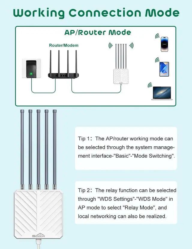 Working Connection ModeThe outdoor WiFi extender supports two working modes: AP and router. These two modes are very suitable for converting wired connections to wireless networks. Among them, the AP/router working mode can be selected through the system management interface-"Basic"-"Mode Switching", and the relay function can be selected through "WDS Settings"-"WDS Mode" in AP mode to select "Relay Mode", and local networking can also be realized.