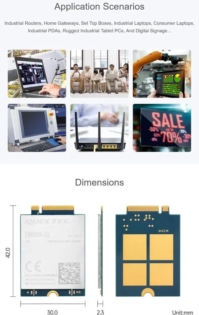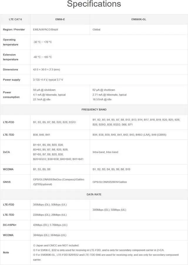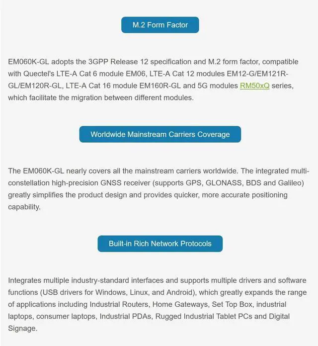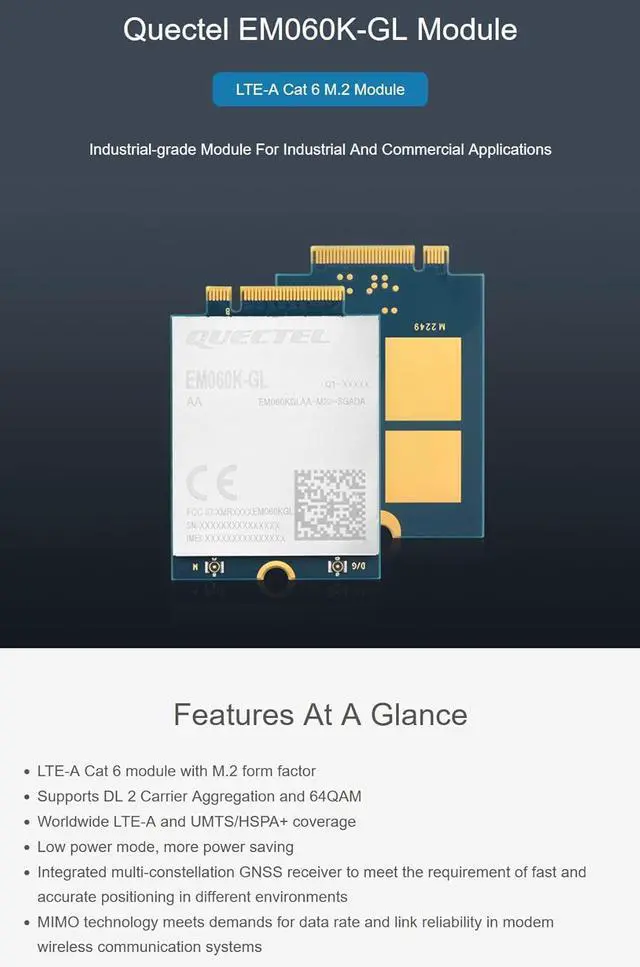 • Quectel EM060K-GL Module, LTE-A Cat 6 module with M.2 form factor, Global Multi-band GNSS Positioning