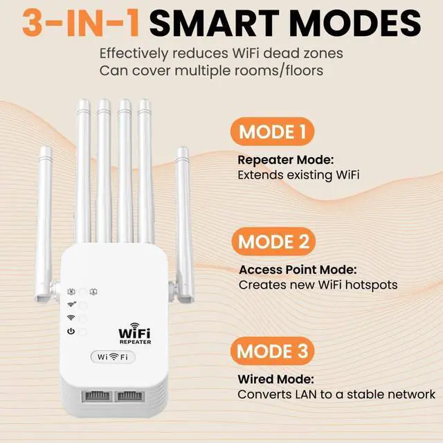 Flexible Connection Modes Supports repeater, access point, and wired Ethernet use to fit different network expansion needs