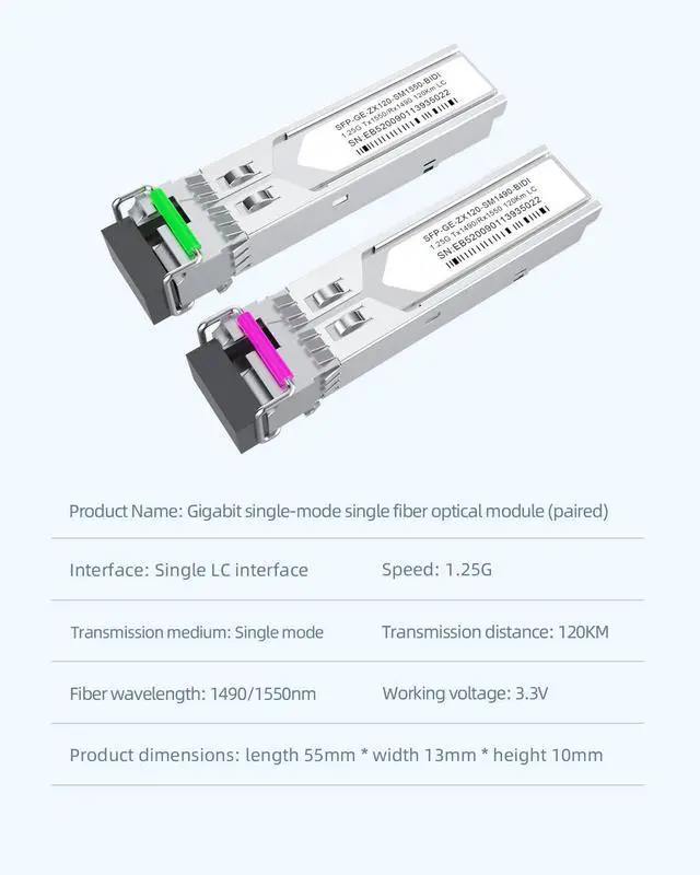 Single Fiber Bi-Directional TechnologyThe lc port single mode single fiber SFP+ fiber module adopt WDM (Wavelength Division Multiplexing) technology, this BIDI transceiver enables bidirectional data transmission over one single-mode fiber (no need for two separate fibers). It significantly reduces fiber usage and wiring costs, perfect for fiber-constrained environments like old building upgrades or campus networks
