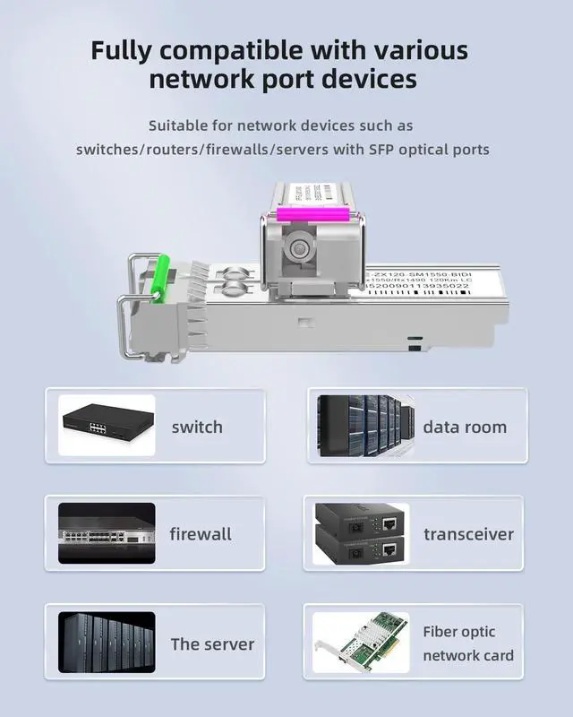 Easy to install and wide compatibilityThe 10G SFP+ transceiver module supports hot-swappable,LC interface enables plug-and-play, quickly connecting to switches, routers, firewalls, or other network devices with SFP ports.The SFP+ fiber optic module is compatible with Cisco/Huawei/H3C/Ruijie/ZTE/HP/Intel/Other brands