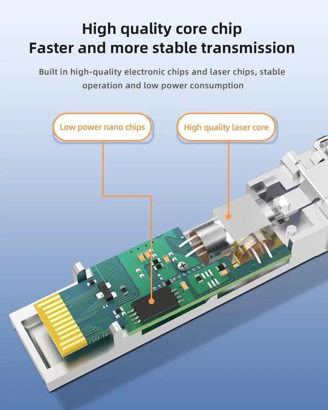 Premium Hardware for Stable & Durable PerformanceThe SFP+ fiber transceiver module features full plated metal shell for strong anti-interference and heat dissipation, paired with high-quality core chip, low-power nano chip, and premium laser diode. Thick gold-plated contacts enhance conductivity, ensuring reliable 10G data transmission even in harsh environments