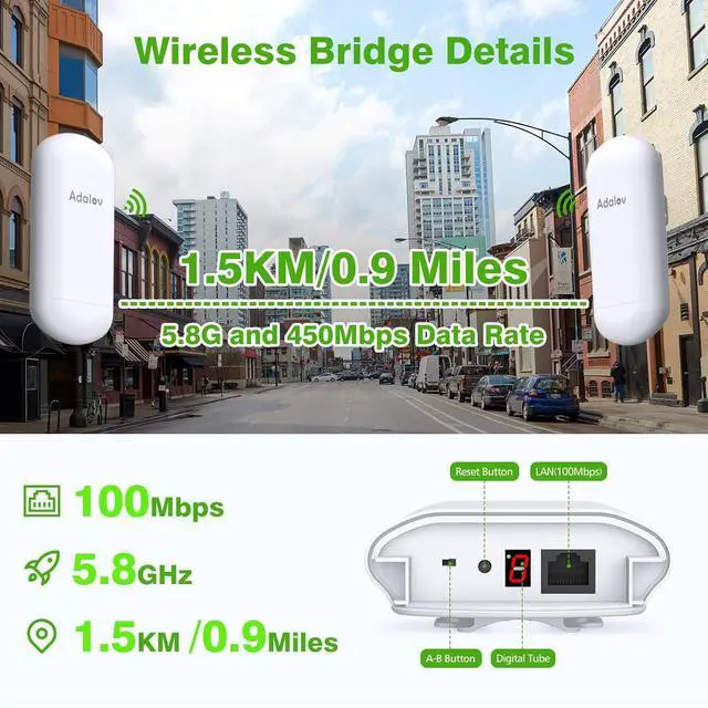 5.8G Wireless Bridges Offers Higher SpeedsOutdoor Wifi Bridge 5.8G frequency makes long-range wireless bridges have better anti-interference performance, good compatibility, and strong anti-adjacent channel interference. Wireless Outdoor bridge systems are more suitable for long-range connections. Several installations of these bridge systems, have been at 2 miles Line of Sight. It supports Wireless Bridge mode, default Pre-program WDS mode, and no need for a long cable to connect to the camera with your PC Bridge.
