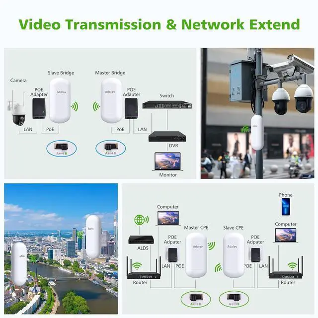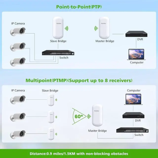 Plug and Play p2p Wireless BridgeEthernet wifi bridge supports point-to-point and point to Multi-Point wireless connections, pairing can be done by dialing without having to access the GUI, to give you a full plug-and-play bridge. With a fast 100MBPS wireless speed, a Point-to-point bridge easily helps you expand the network range to the second building(barn, shop, warehouses, garages), or wireless extend the IP camera monitoring range. Please feel free to contact us. GET 100% SATISFACTION.